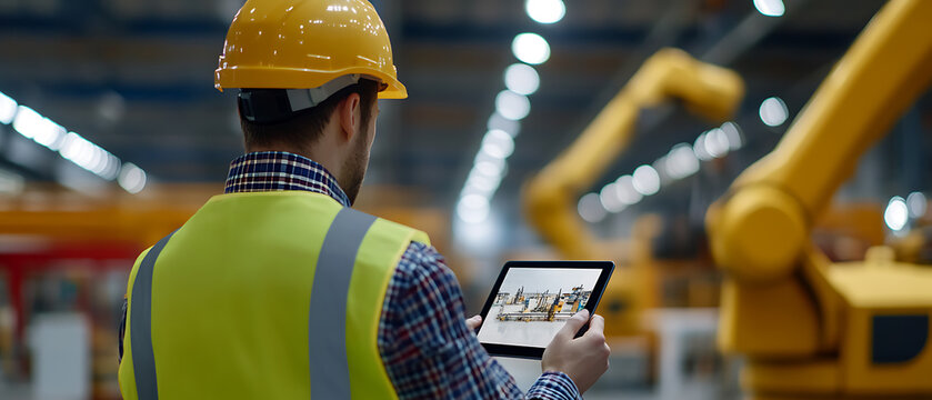 Engineer analyzing digital data and statistics on a screen while wearing a hard hat and safety goggles in a modern industrial work environment.
