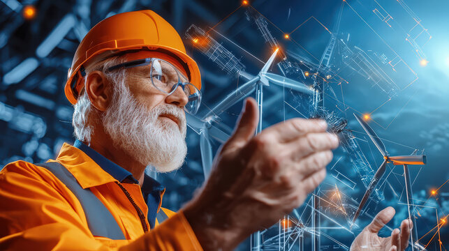 Senior engineer in orange hard hat and safety vest gestures while discussing wind farm technology, with digital schematics overlaying image