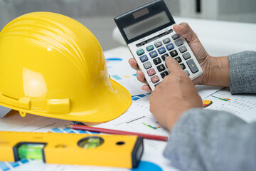 business woman hand working and laptop with on on architectural project at construction site at desk in modern office