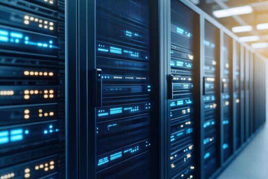 Data Center with Rows of Servers and LED Lights Glowing Brightly