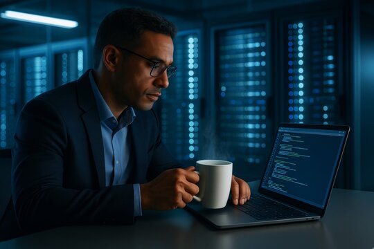 Businessman analyzing code on laptop while drinking coffee in data center environment with abstract blue light background at night. Ai generative