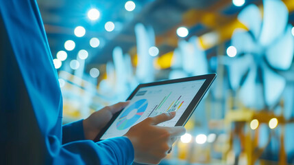 Renewable energy engineer analyzing data over wind turbine blueprint