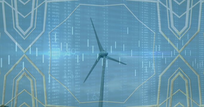 Showing wind turbine standing under cloudy sky, with numerical tables, chart lines, polygon frames