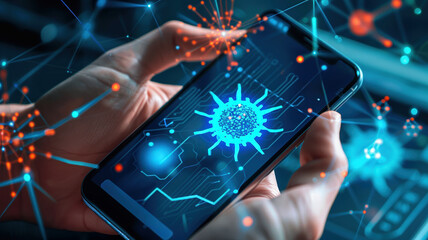 Digital Virus Spread Concept - Close-up of Smartphone Screen Displaying Red Virus Symbol Amidst Network Connections Highlighting Cybersecurity Threats