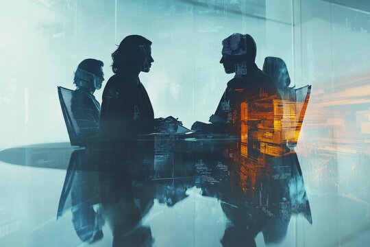 Silhouetted Business Team Meeting in Modern Office with Digital Data Overlay