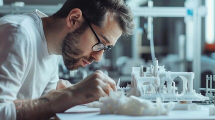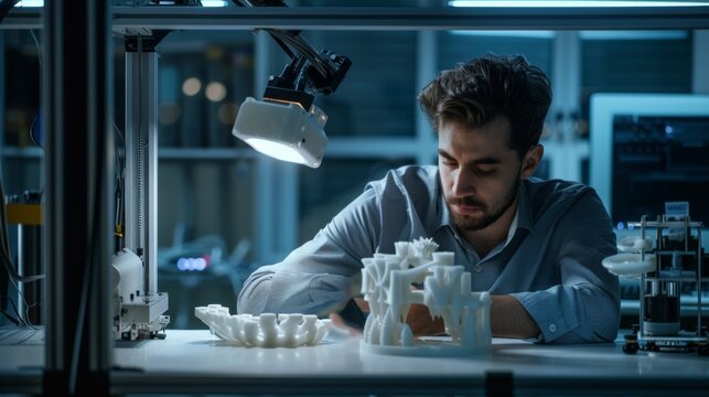 An engineer examining a prototype produced by a 3D printer, evaluating its strength and functionality for real-world applications.