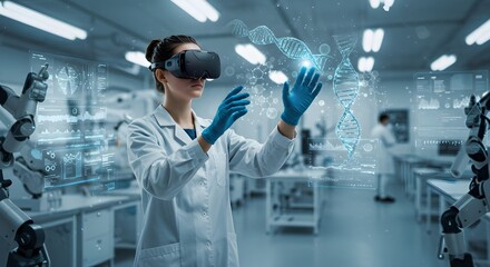 Scientist uses VR technology to explore DNA genetic code in a modern laboratory with robotic arms.