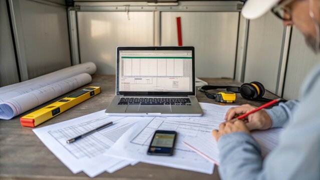 A medium closeup of an engineer analyzing vibration data on a laptop inside a portable site office surrounded by construction plans and tools reflecting the importance of data