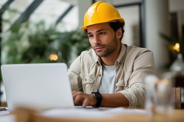Engineer In Office Analyzing Construction Plans On Laptop Images