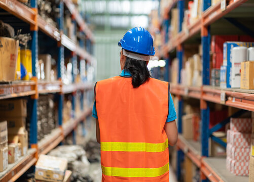 Back view of Asian female worker checking products or goods on shelves shelf in automotive spare parts warehouse. Woman wearing safety vest and helmet working at warehouse