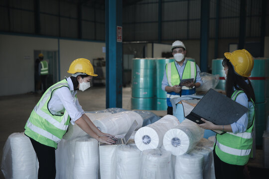 Female Inventory Manager working on digital tablet and checking quality of product at mask factory. Warehouse worker working at storage building.