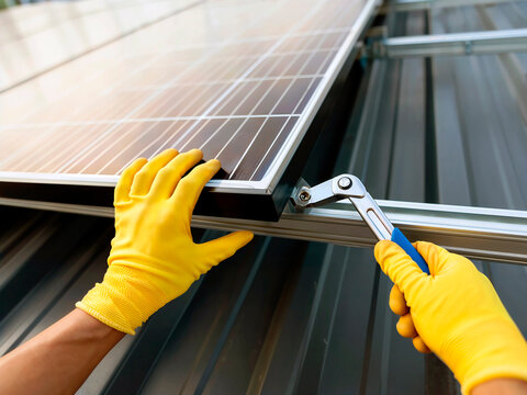 Worker building solar panel system on metal rooftop of house. Man engineer installing photovoltaic solar module outdoors. Alternative, green and renewable energy generation concept.