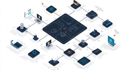 A detailed flowchart illustrating interconnected digital devices and systems, highlighting the complexity of modern technology and data exchange within a network infrastructure.