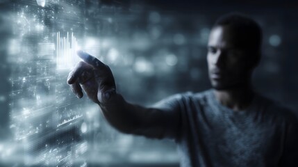 Man s hand interacting with a glowing futuristic digital interface displaying business data and analytical charts in a dark high tech environment