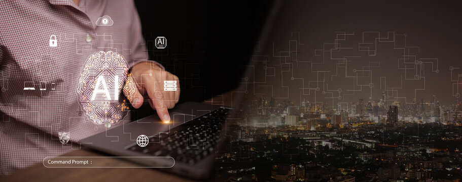 Prompt engineer using artificial intelligence on a laptop, interacting with glowing AI brain interface over a city. Generative AI, command prompts, smart digital technology, and business innovation.