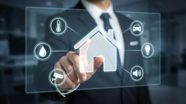 A professional in a suit interacts with a transparent digital interface displaying smart home technology icons emphasizing connectivity and future living high quality