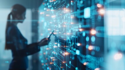 Female engineer interacting with virtual data interface in server room