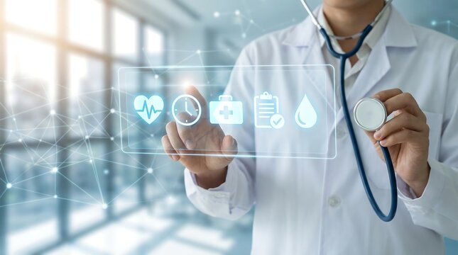a healthcare professional utilizes advanced digital technology interacting with a holographic interface displaying vital health icons and symbols representing modern medicine high quality