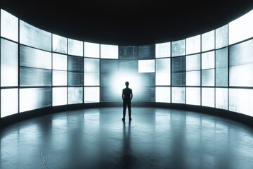 High-tech server room with multiple blue screens displaying code and data analytics at night