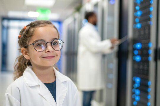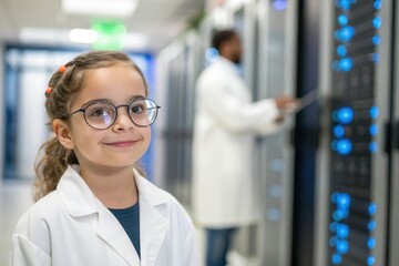 A young girl with glasses wearing a lab coat stands smiling in a technology lab. In the background, a scientist operates computer servers, showcasing a blend of curiosity and professional activity in