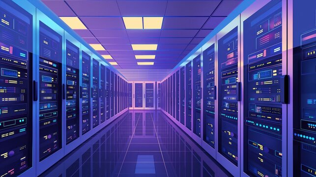 Modern data center with rows of network servers processing and storing digital information, ensuring efficient data management and connectivity
