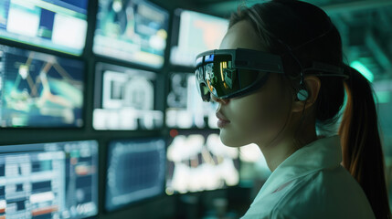 Woman engineer working in dark room with multiple monitors, controlling complex industrial system, using advanced technology and futuristic interface for urban communications.