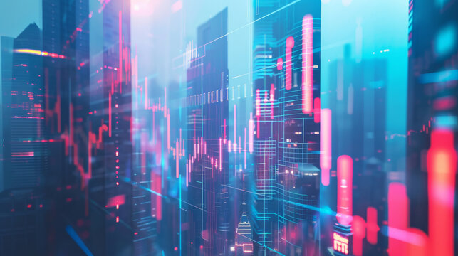 A futuristic cityscape with digital stock market graphs overlaying skyscrapers, merging technology with urban living.