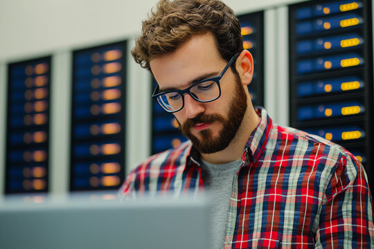 Engineer Overseeing Cloud Data Transfer In Server Room Images