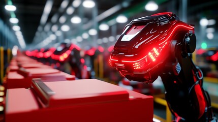 Modern robotic arms working in automated assembly line in a futuristic factory setting. High-tech machinery and advanced manufacturing technology.