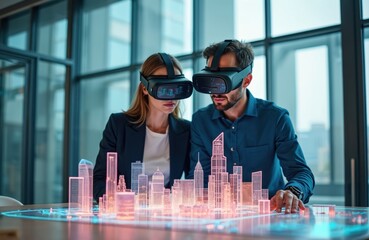 Male and female architects wearing augmented reality glasses work with a 3D model of the city. High-tech specialists in offices use software to simulate virtual reality.
