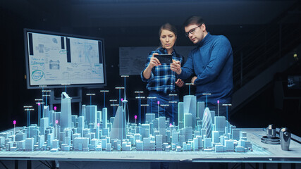 Architect and Engineer have Discussion and Use Augmented Reality Smartphone to Design Sustainable 3D Megalopolis City Model. Futuristic Office with Architectural Designers. Graphical VFX Image.