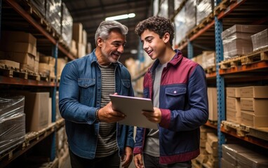 Mature warehouse logistics manager with a tablet in his hand shows a young worker a warehouse with shelves and boxes. Generative AI