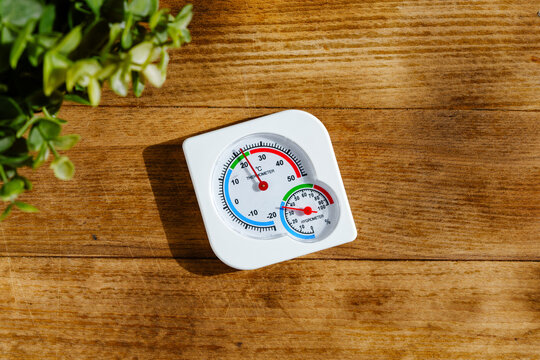 White Thermometer On Wooden Surface Showing A Temperature Of 15 Degrees Celsius