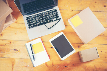 Closeup brown note book , brown pen , tablet and smart phone on gray fabric capet textured background in top view in work concept