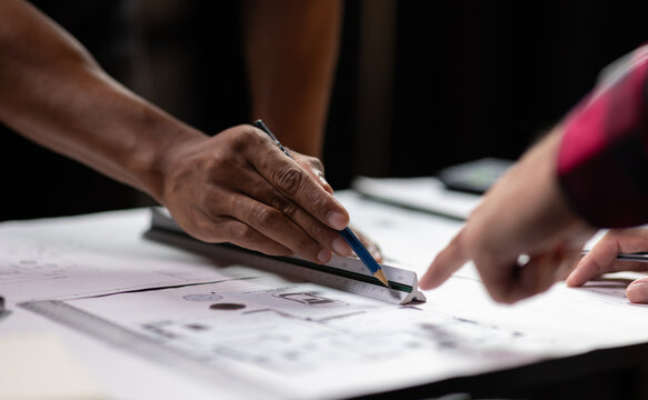 Architect using ruler and pencil reviewing blueprint of architectural project. Two architects are analyzing blueprints for a new building project, using a ruler and pencil to make measurement.