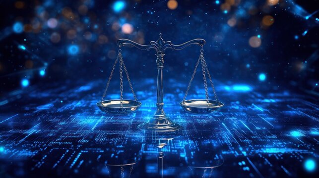 A digital representation of a balanced scale symbolizing justice and fairness in a futuristic setting.