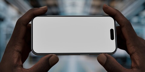 Black African-American male using smartphone with a blank white screen. Industrial, manufacturing plant, machinery apps mockup. Horizontal phone orientation