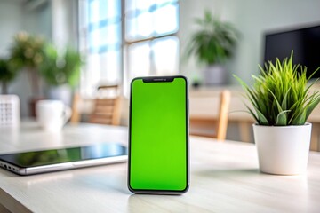 mockup 3D smart tablet with blank green screen standing on podium, black background with light smoke, Ai generated Images
