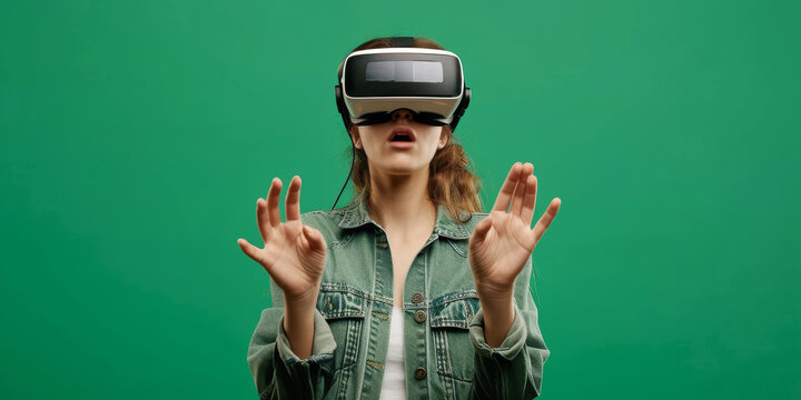 Woman in denim jacket using a virtual reality headset against a green screen background.