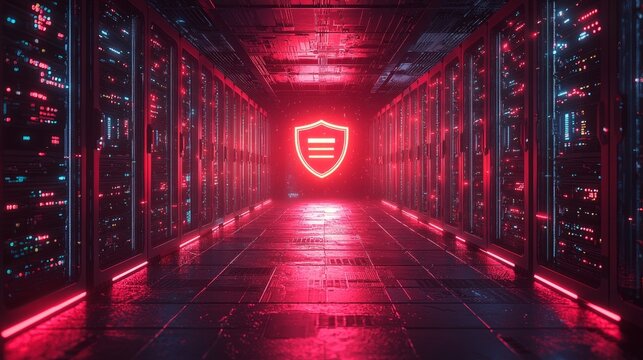 A server room with neon-lit servers and a holographic shield overlay, emphasizing secure internet infrastructure