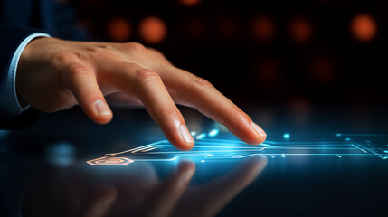 close up of a businessman's hand touching a virtual screen, modern futuristic technology innovation