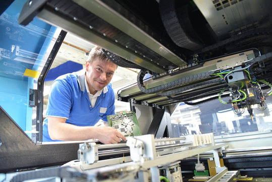 Automated Machinery Places Microchips Onto Circuit Boards, Precision Robotics for Semiconductor Production. Advanced Technology in Modern Assembly Line, Optimizing Electronics Manufacturing Processes.