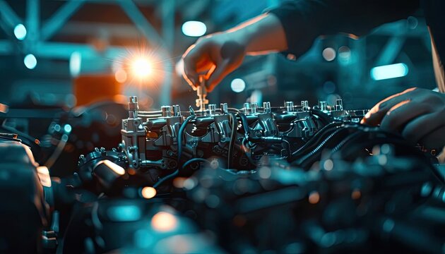 Close-up of a mechanic working on an engine in a dimly lit workshop, highlighting the intricacies and details of automotive repair and maintenance.