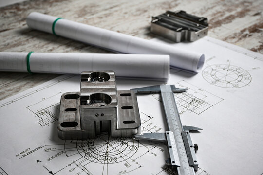 Metal machined parts lying on a technical drawing with a caliper, showcasing precision engineering and manufacturing
