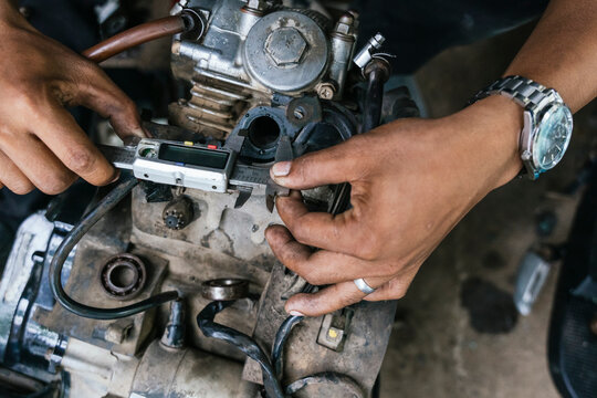 Mechanic measuring motorcycle engine components with precision