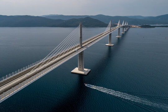 Aerial view of the sleek, modern Peljesac Bridge stretching across the azure waters, connecting mainland Croatia with the Peljesac Peninsula, Komarna, Dubrovnik-Neretva County, Croatia.