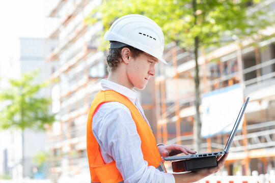 rear view of professional engineer manager standing concentrate focus multi exposure with building construction industry background construstion engineer concept