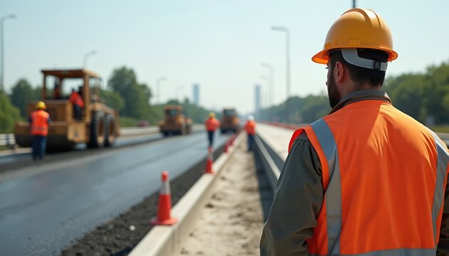 Worker in orange vest, helmet supervises road asphalt paving, highway construction. Road workers team laying asphalt on roadway. Infrastructure, transportation industry, teamwork, civil engineering.