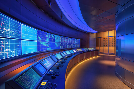 Wide shot of a futuristic control room bathed in blue light and displaying complex data on a wall of monitors
