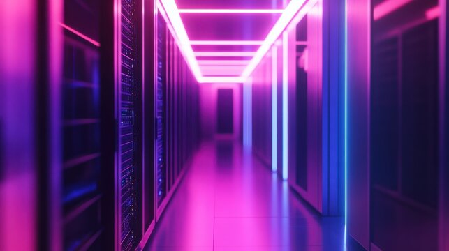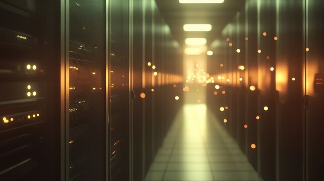 Servers data center room with bright bokeh light going through the corridor 3D rendering